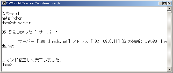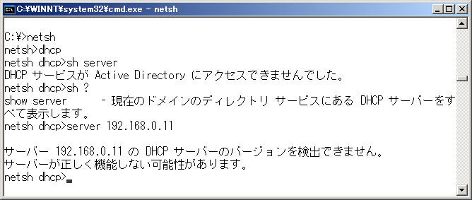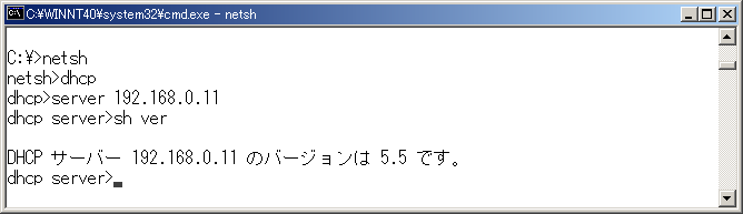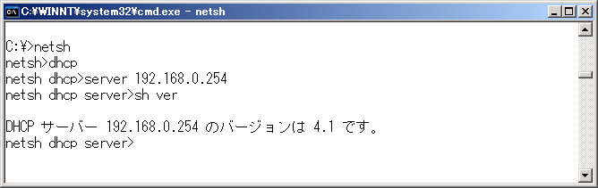 netshでDHCPサーバー情報にアクセスできる。dhcpコンテキスト内でヘルプを表示すると、DHCPサーバーのどんな情報にアクセスできるかがわかる。 dhcpコンテキスト内でDHCPサーバーのIPアドレスを指定することも可能である。NT4.0のDHCPサーバーにもアクセスできる。