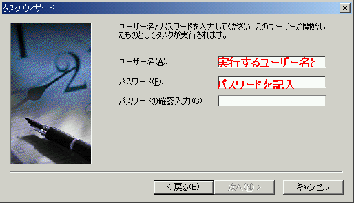 実行するユーザーアカウントとパスワードを入力する。