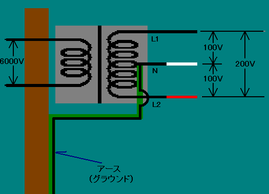 柱上トランスの二次側中点は、大地に接地・・・アース(グラウンド) されている。
