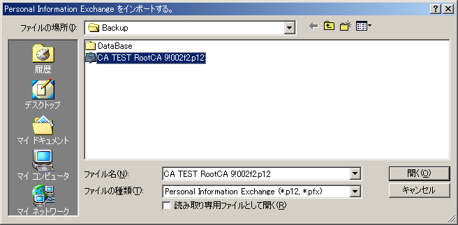 9. 以前のバックアップファイル(*.p12)を選択し[開く]をクリックします。