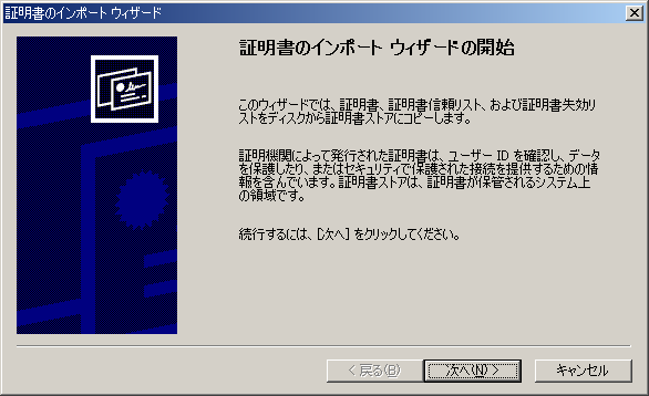 [証明書] ダイアログ ボックスで、[証明書のインストール] をクリックし、証明書のインポート ウィザードを起動します。