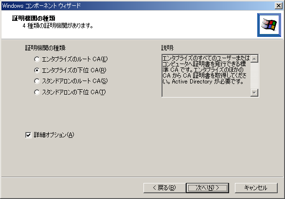 6. 証明機関の種類として[エンタープライズの下位CA]を選択し、[詳細オプション]にチェックを入れます。