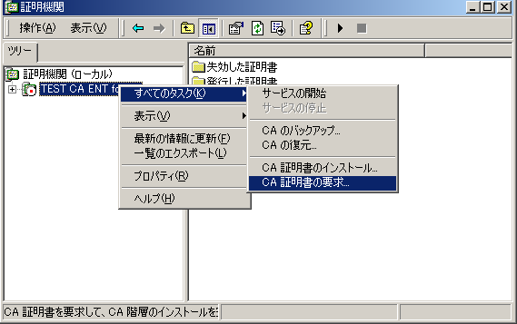 3. CA機関の右クリックメニュー[すべてのタスク]−[証明書の要求]をクリックします。