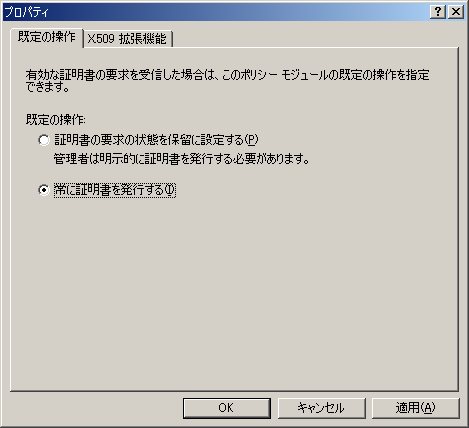 4. [規定の操作]を「常に証明書を発行する」に変更し[OK]をクリックします。