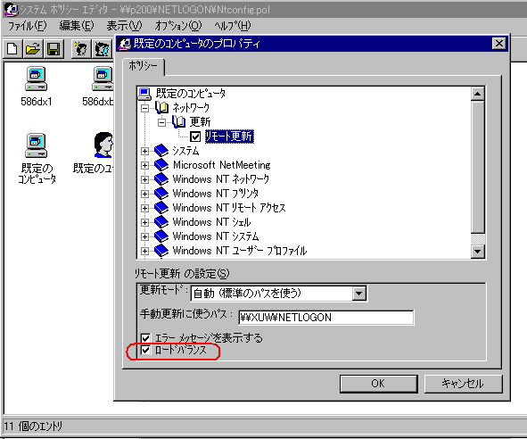 • w95コンピューターがブロードキャストやWINS・LMHOSTSで、他のDCの存在を把握していても、システムポリシーでロードバランスがdisableの場合には、常にPDCのみからポリシーファイルをダウンロードする、