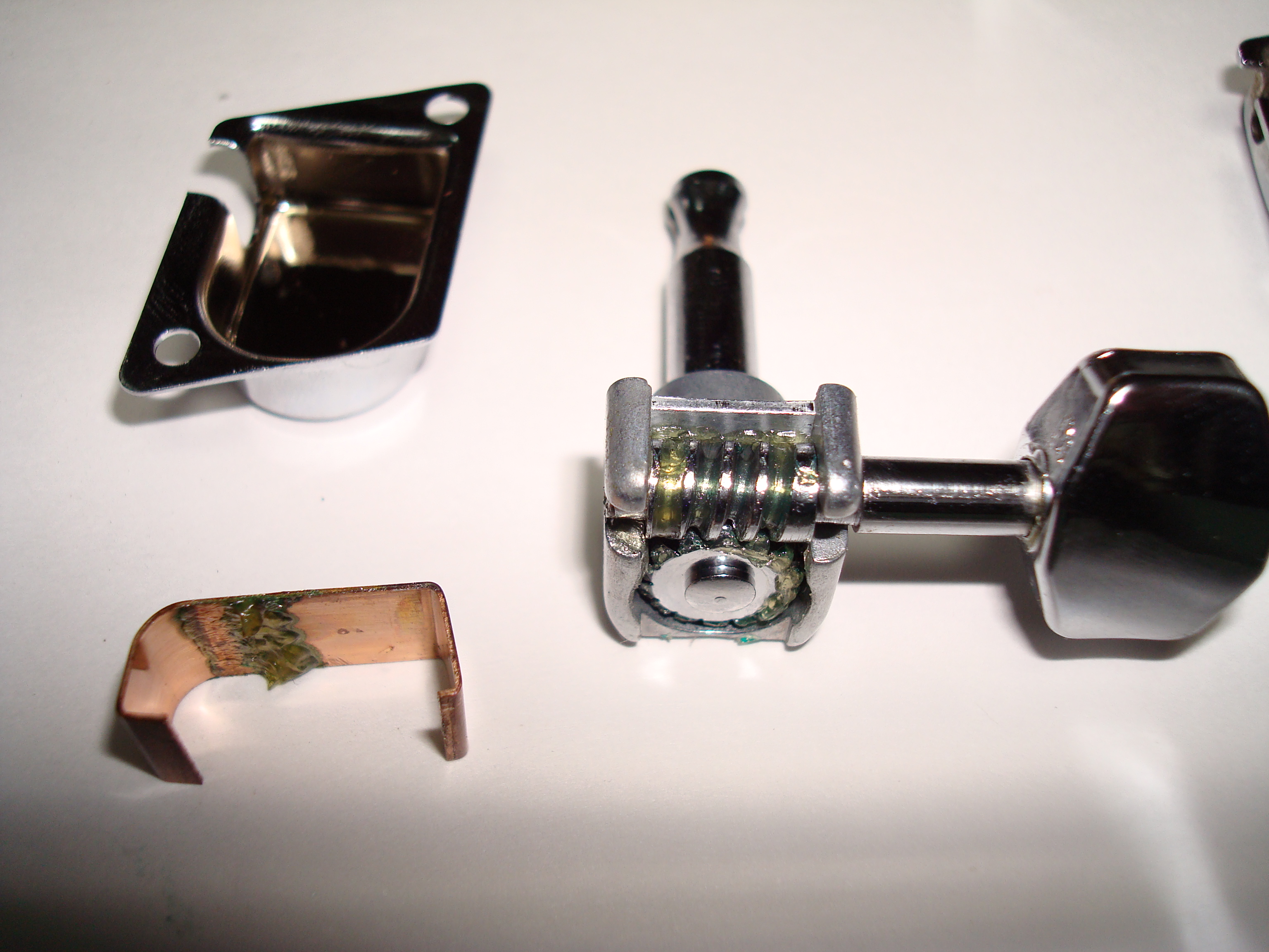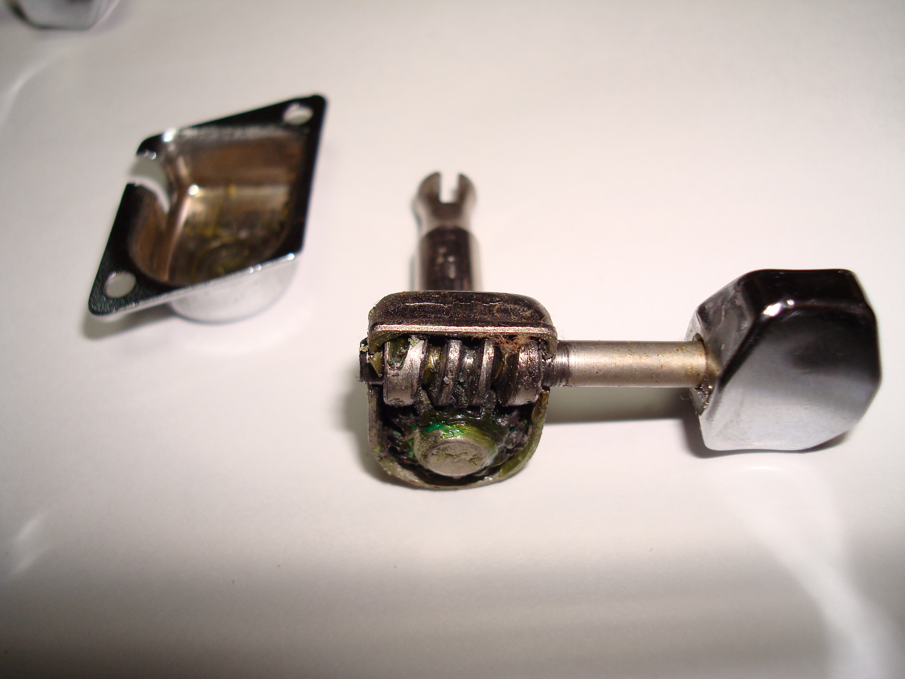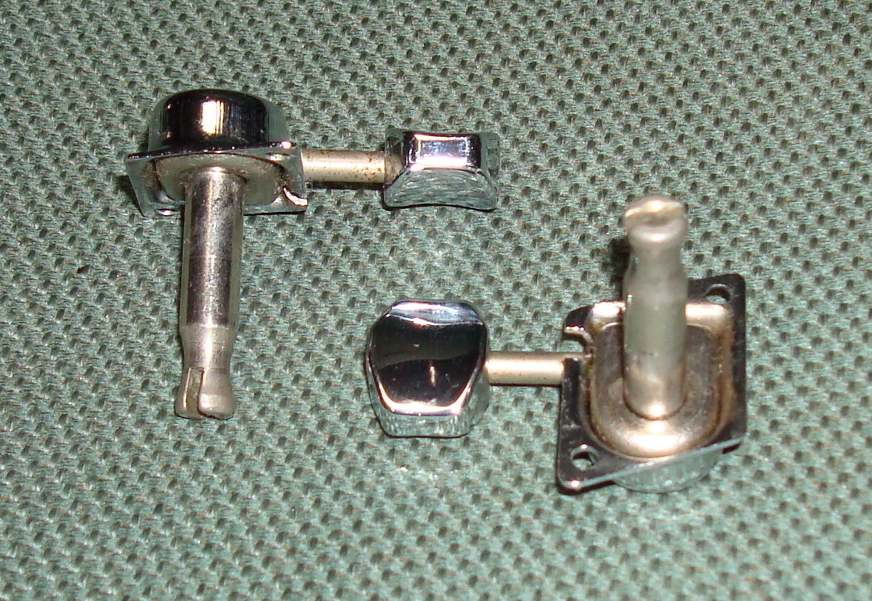ギアは好みもあるだろう。1970年代にオリジナルF-Keyをロトマチックタイプに交換するのが流行った。これをすると、ヘッド側のシャフト穴を大きく加工する必要がある。シャーラーF-Keyの場合、最初からロトマチックと同じ大きい穴なので、ペグ交換の時のヘッド加工はいらない。