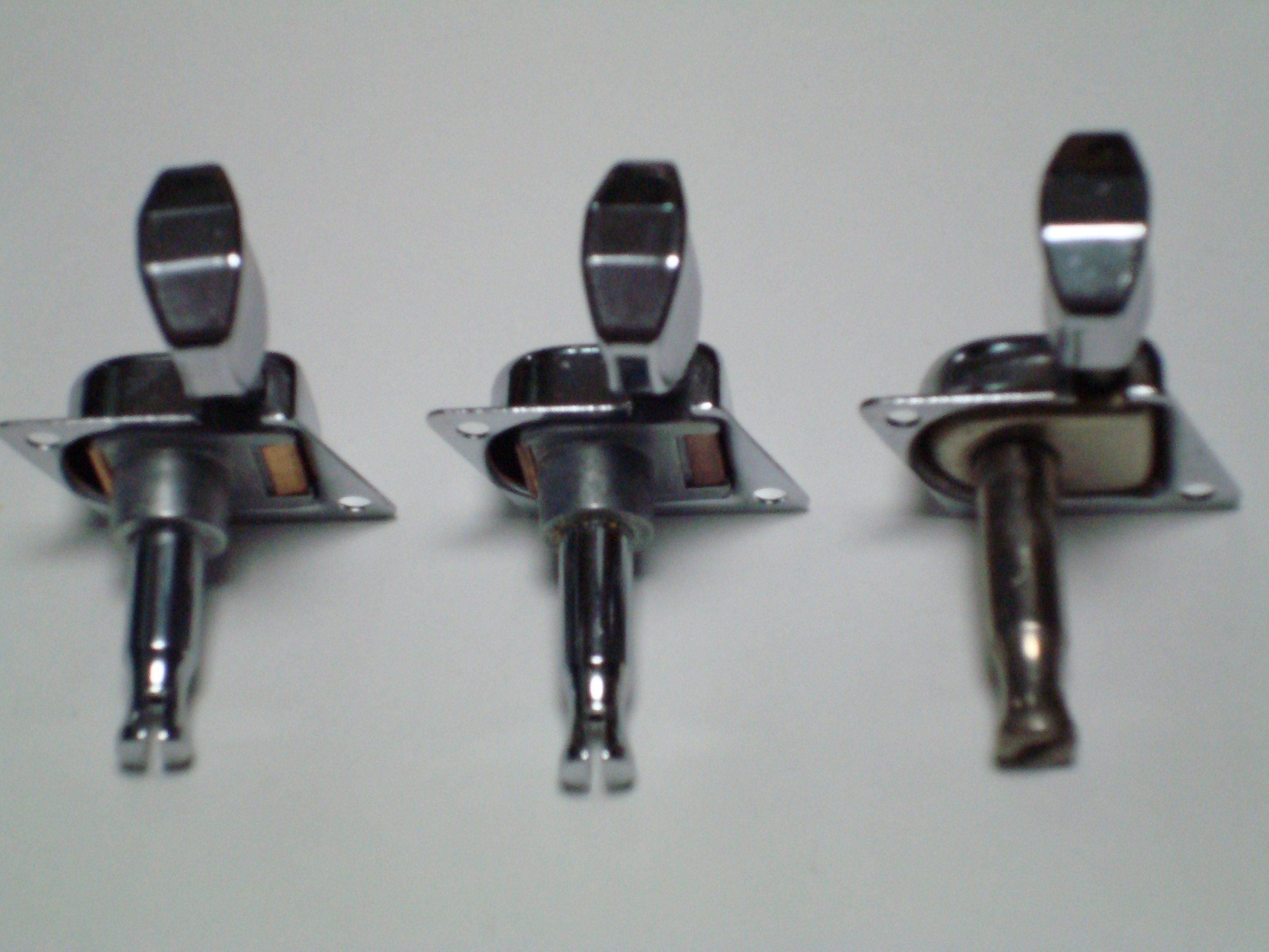 現行のFender USAFender Japanの双方がシャーラーF-Keyを使用し、またReplacement Partsとしてセット供給している。この現行シャーラーF-Keyにシャフト長が2種類存在する。上記の写真のようにMEX現行USA)が一番短いが、真ん中の1976年後期のものと同じ長さのシャフトのものも現行品で存在するのだ。実際に筆者は2006年にReplacement Partsとして購入したF-Keyのセットで、シャフト長の長いものを入手した。