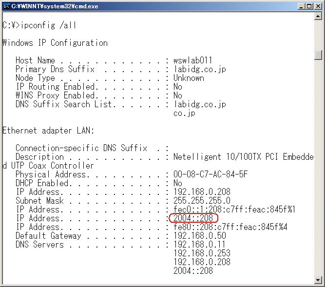 netshコマンドもAug 18th 2013の時点では、netsh interface ipv6 show dnsコマンドは存在するが、結果にDNSサーバーのアドレスが表示されなくなった。ipconfig /allで確認可能である。