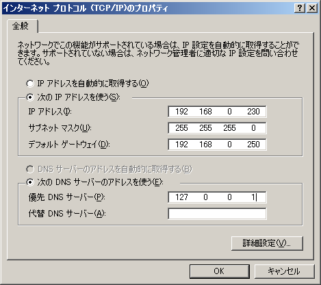 ネットワーク上のWindows Xpは、nameproxyが動作しているWindows PCをDNSサーバーとして設定すればよい。(ここがProxyたる所以だ。)nameproxyが動作しているWindows XpはTCP/IPの設定画面で自分自身をDNSサーバーとして設定すればよい。