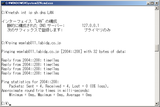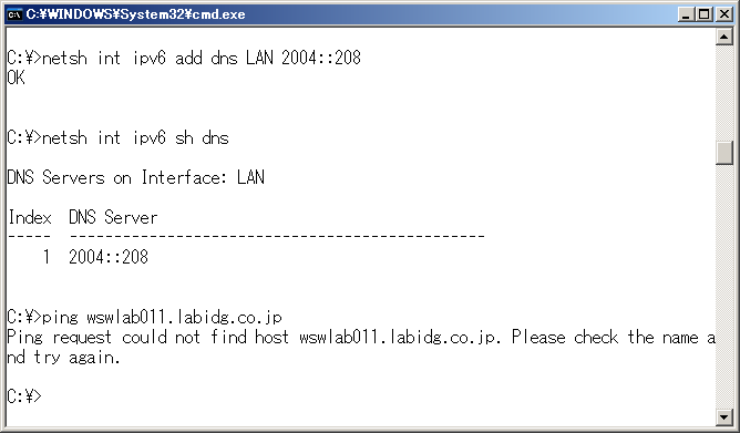 (コマンド操作そのものは受け付けられ、ipconfig /allコマンドやnetsh interface ipv6 show dnsコマンドなどでも設定を確認できる。しかし、ホスト名でpingを実行しても名前解決しない。networkモニタ等で計測しても、クエリそのものを送出していないことが判る。ホスト名解決ではなくIPv6アドレスを利用してのpingは成功する。)