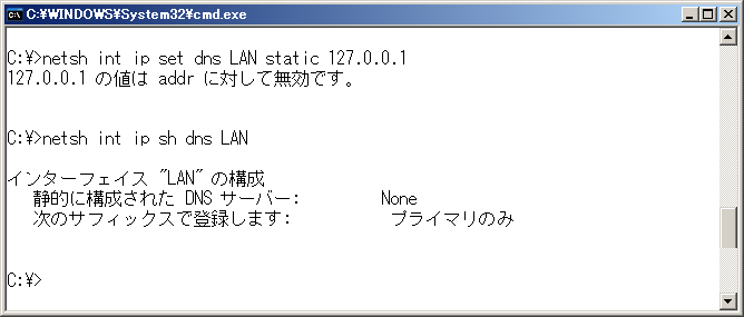• netsh interface ip add dns intfacename 127.0.0.1コマンドや