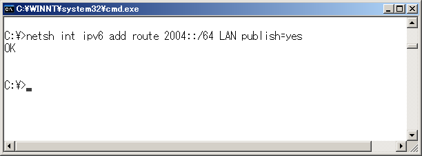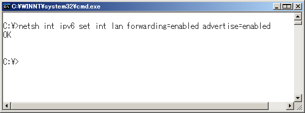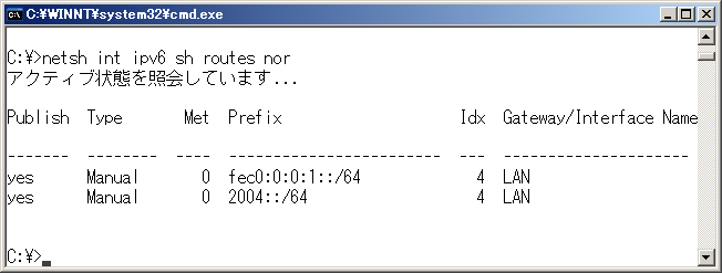 ※ enabledはenableと過去形でなくても通用するようだ。 ネットワークプレフィックスを割り当てる今回のネットワークプレフィックスは、2004::/64とする。コマンド プロンプトで ※ interfaceはintと省略可能。