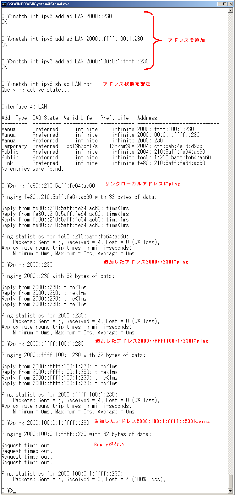 リンクローカルアドレスでは成功する。2000::230はOK、2004::ffff:100:1:230でもOKだ。2000:100:0:1:ffff::230では失敗する。 これは、WindowsでのIPv6実装のバグである。このバグは、Windows Vistaでは修復されている、とのこと。Windows Server 2003 Release2ではどうかというと、筆者は知らない。 実験して欲しければ金をくれ!である。 |