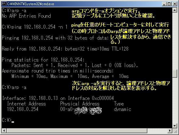 Address Resolution Plotocol論理アドレスと物理アドレスの対応を解決し、テーブル・リスト(表)に記憶するプロトコル。 ARPコマンドAddress Resolution Plotocolを利用し、アドレス解決結果を表示するコマンド