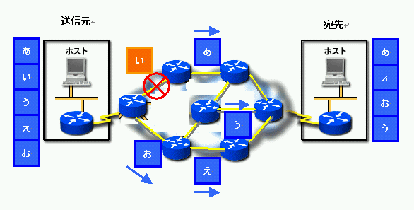 2. 送出されてから到着するまでの間に経路に障害が発生すると、次のパケットが取る経路は次善の経路を選択する。(例:う・え・お)