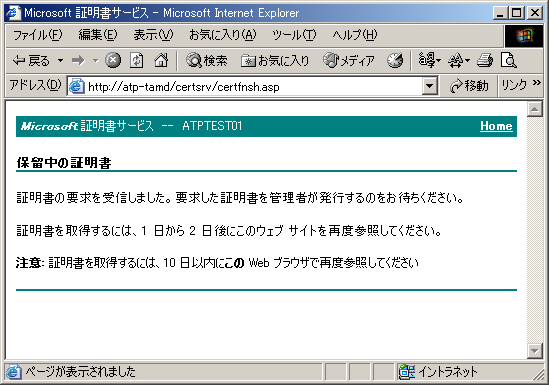 [保留中の証明書] ページが表示され、次のメッセージが表示されます。証明書の要求を受信しました。要求した証明書を管理者が発行するのをお待ちください。 証明書を取得するには、1 日から 2 日後にこのウェブ サイトを再度参照してください。