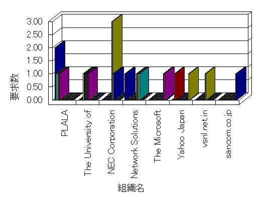 組織ユーザーにインターネット接続を提供する、商用または非営利団体、学術・行政機関などの、インターネット ドメイン で識別される団体や組織です。Microsoft Site Server Analysis は同じ組織に登録されたすべてのドメインを 1 つの組織としてグループ化します。ドメインがデータベースで使用できない場合は、1 つのインターネット ドメインが 1 つの組織を識別するのに使用されます。
