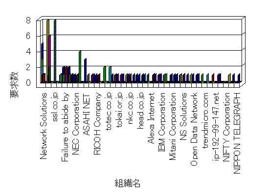 組織ユーザーにインターネット接続を提供する、商用または非営利団体、学術・行政機関などの、インターネット ドメイン で識別される団体や組織です。Microsoft Site Server Analysis は同じ組織に登録されたすべてのドメインを 1 つの組織としてグループ化します。ドメインがデータベースで使用できない場合は、1 つのインターネット ドメインが 1 つの組織を識別するのに使用されます。